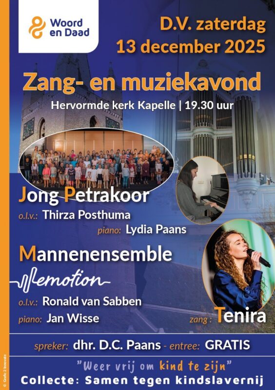 Op zaterdag 13 december zal in de Herv. Kerk van Kapelle het jaarlijkse Kerstconcert worden georganiseerd door Woord en Daad. Hieraan zullen meewerken het Jong Petrakoor onder leiding van Thirza Postuma, het mannenensemble Emotion met Ronald van Sabben als dirigent en Jan Wisse piano. Ook de bekende zangeres Tenira zal verschillende liederen zingen. Zij wordt op de piano begeleid door Lydia Paans die ook het Jong Petrakoor zal begeleiden.